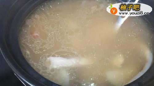 2把浸泡好的羊肉清洗干净,洗得羊肉颜色显得白白的没有一点血水,起锅放入清洗好的羊肉,加入足量清水漫过羊肉2个手指节即可,煮开后捞出汤水表面的血沫和浮末。把煮开的羊肉汤全部倒入一个砂锅里,加入适量蒜米片、生姜片、胡椒粉、花椒粒和料酒,盖上锅盖调小火慢炖1个小时左右。