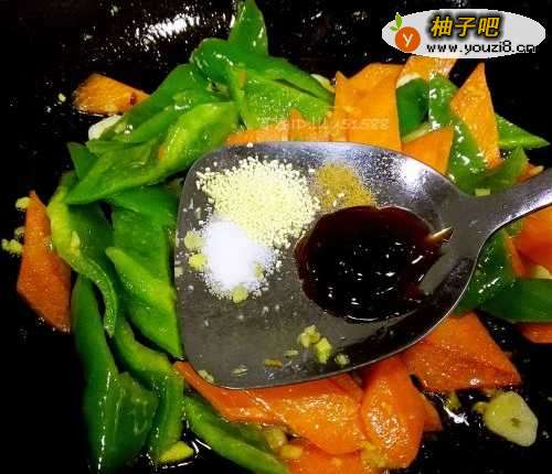 7加入盐,鸡精,五香粉,蚝油炒入味。注意青椒不能炒时间太长了。