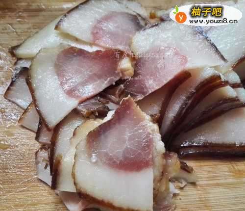 2腊肉切片,备用。