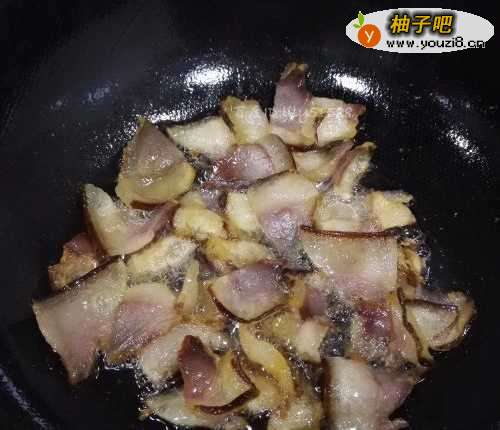 4因为腊肉太肥了,所以先要把腊肉放锅里炸一两分钟,把肥油炸一点出来,炸好的腊肉先倒在盘子里备用。