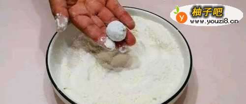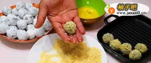 4再滚上一层面包糠,也就是将葡萄先裹面粉,再裹蛋液,最后再裹面包糠,顺序不要错哦,不要将葡萄一下子全倒进盘里裹,要一个一个地裹,不能着急,不然会挂不匀的。