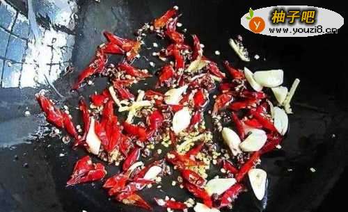 3锅烧热注入油,七分热时倒入葱姜蒜辣椒花椒炝出香味。加入酱油、红油、一碗水,少量的盐调味。