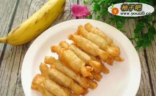 4锅中放入适量的油,当油温三成热时放入香蕉糖果,小火慢炸。