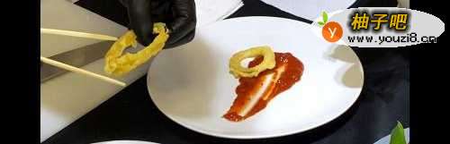 10洋葱圈裹上一层鸡蛋糊,将洋葱圈下入锅中炸制,炸只金黄色捞出备用