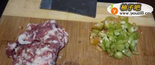 3将猪肉洗净,猪肉剁成大末,不要太碎,青辣椒切小块备用。