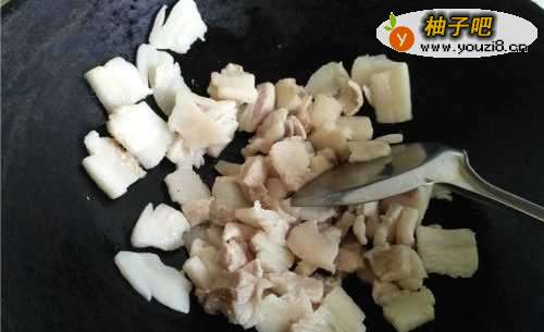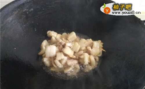 2锅先烧热,将肥肉先放入锅中,炸出少许的猪油。