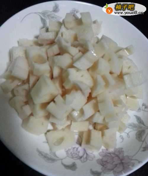 2将莲藕切成丁,过水捞出备用,如果藕的颜色不是很白,可以在水中加入少许白醋