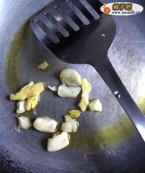 5锅中再加入少量油烧热,放入姜、爆香蒜