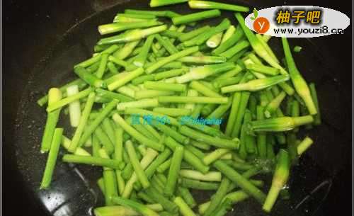准备一把新鲜的蒜薹,将蒜薹尾部枯萎部分摘掉,头部比较老的部分切掉,然后将蒜薹切成小段状。