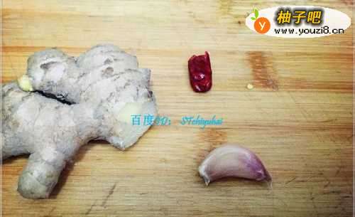 5准备一些辅料:生姜、蒜头、辣椒干,分别处理一下,同时将刚才焯蒜薹的锅清洗一下,沥干水渍,加入适量的油,放入辅料爆香一会。