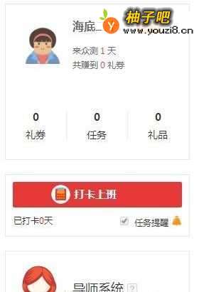 5完成上面两项后,可以单击导航栏的“任务”,在页面的右侧可以看到个人信息,记得每次开始一天任务前要上班打卡,下班也要打开哦!