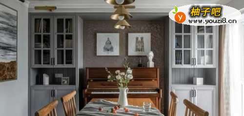 4庆幸的是,灰白地砖最终露在外面的面积并不多,很多要被沙发、餐桌挡住;而木门的面积与墙面的面积比较起来又小得多,况且灰色属于无彩色,不会与其他色彩冲突。
