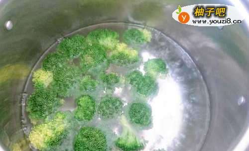 5锅中注水烧沸后,撒入一勺盐,把西兰花倒进去焯熟后捞出沥水码放在盘子里。