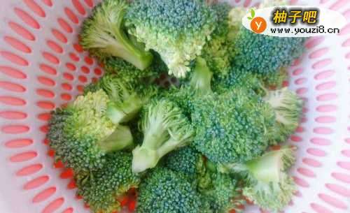 2西兰花掰小朵,在盐水里浸泡20分钟后,冲洗干净,沥干水份。
