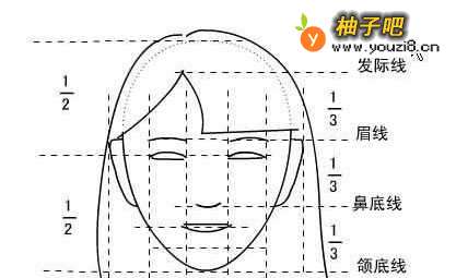 2“五眼”的判别:是指眼角外侧到同侧发际边缘,刚好一个眼睛的长度,两个眼睛之间也是一个眼睛的长度,另一侧到发际边是一个眼睛长度。这就是“五眼”。