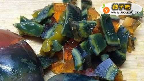 2皮蛋去壳,切成一立平方厘米左右的小块备用