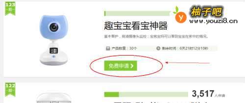 2进入后即可看到360商城正在开展试用申请中的智能产品,每个产品都会显示对应的试用产品数量、申请人数、剩余申请时间。点击“免费申请”按钮开始填写申请资料。