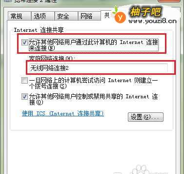 5勾选第一个复选框,并在“家庭网络连接”下拉菜单中选择“无线网络连接2”,单击“确定”按钮。注意:设置完成之后请按照系统提示断开网络,并且重新连接一次,以使设置生效。