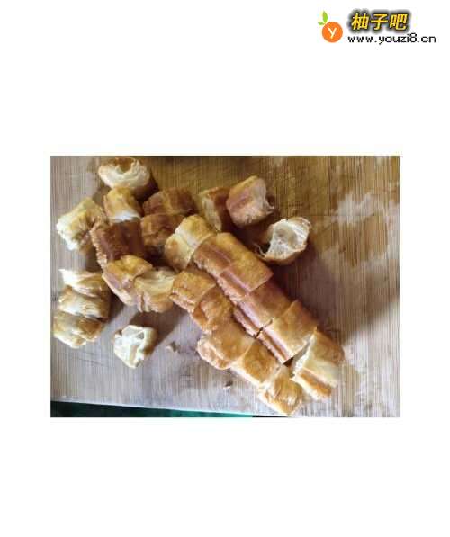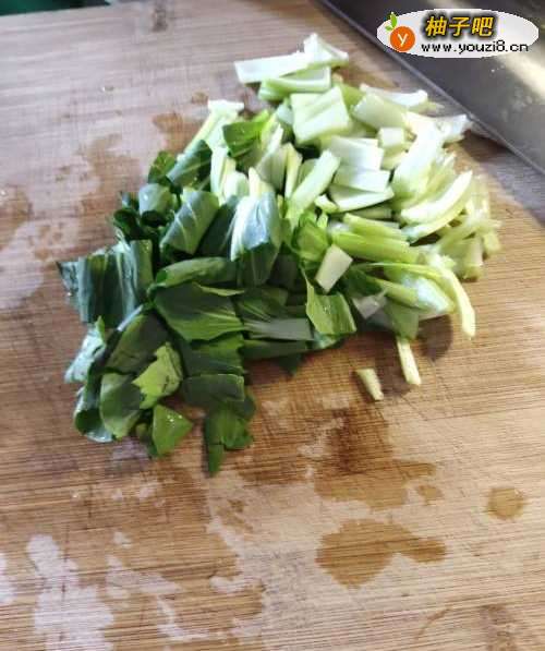 小青菜和油条备用好,锅里煮半锅水煮开,把玉米团一个个捏成一片放入锅里煮加1勺猪油煮5分钟,再倒入青菜煮4分钟加1茶勺食用盐,倒入油条煮1分钟就可以了,油条本身就有油所以不需要加食用油。