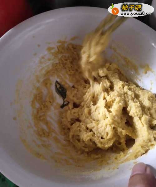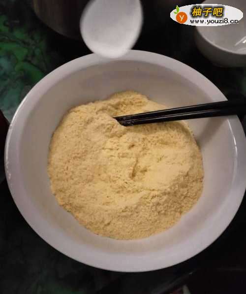 2倒入温水或开水搅拌均匀,不太稀拉能捏成型的玉米团。