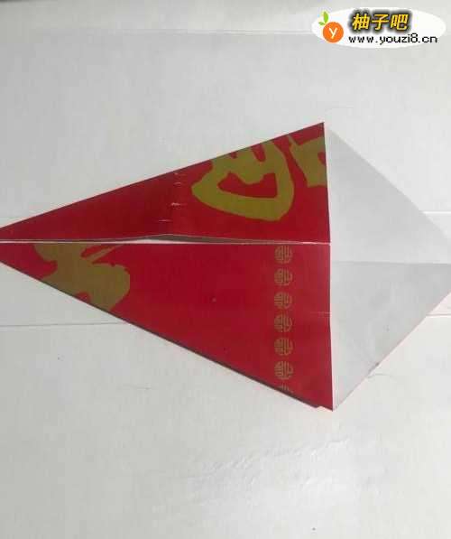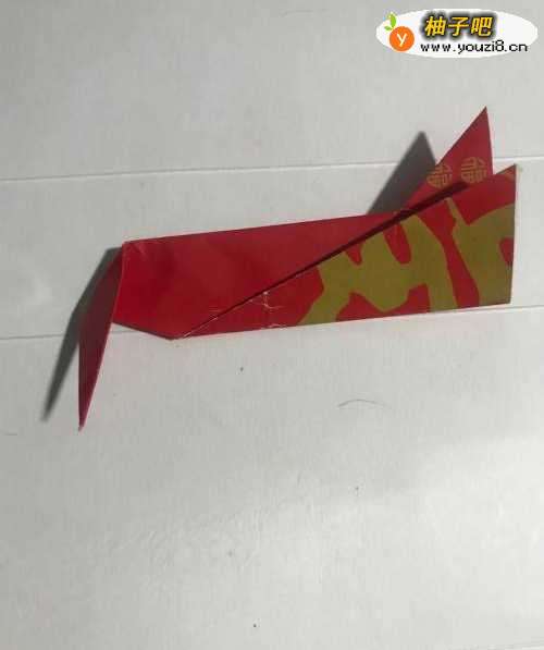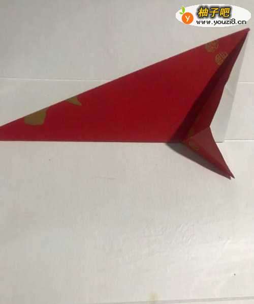 6第六步 上层的底边对齐小豁口折倒之后 再把它左右翻过来 同样折叠一遍 然后再把它左右翻过来 前面的尖角向下折叠大约三分之一处