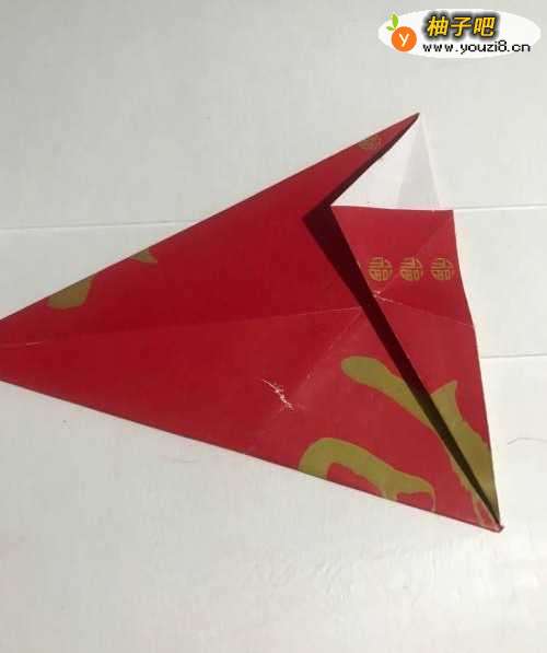 3第三步 右边三角向左折叠完之后 再按着右上角 拿起三角的尖角向外对齐双边折叠 然后再取开 按着右下角 同样拿起尖角向外对齐双边折叠