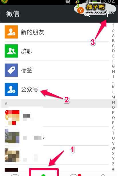 打开微信,点击“通讯录”,打开“公众号”,点击“+”打开公众号搜索