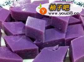 5加入紫薯泥同时不停搅拌避免黏锅,再煮5分钟后熄火,将煮好的紫薯泥倒进一个容器中放到冷却后可以放入冰箱凝固。到此制作完成。