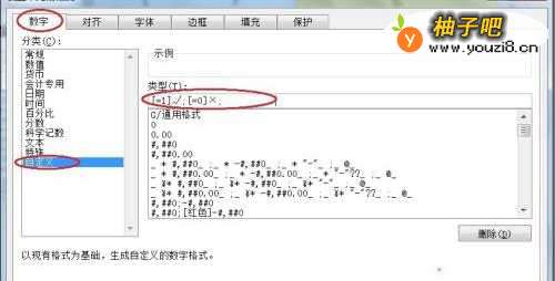 4在EXCEL中,打开【8.XLSX】后,选择【G2:G7】单元格区域,点击鼠标右键,弹出快捷菜单,选择【设置单元格格式】,弹出【设置单元格格式】→【数字】→【自定义】→【类型:“[=1]√;[=0]×; ”】如下图所示。
