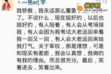 有一天,我上初中了,从这时起我不在是小学生了。 从这时起,我认识了一伙天不怕地不怕的朋友,慢慢的,随着时间的推移,我们成了兄弟姐妹。 初三毕业了,你们上了高中,丢下了我一年。我痛,但是我不后悔。 复习那年,每次和你们见面,你们各自说着自己的高中生活。我只是在一旁默默的聆听着。从那时起,我感觉我离你们越来越远了。 直到我再次中考,记得那天是下了点小雨,你们都来了,打着伞,向我笑着。看到你们真的很开心。那天把王萌和景向梅送上车去学校,又送封昊宇和严婷去学校。 我高一,你们高二,我高二,你们高三,我准备上高三,你们毕业。就和初中一样,你们没有人等我,陪我再次读初三,我不希望你们这次等我,我不要你们陪我。都走了我一个人也好安下心。 都走,在大学等着我,我回来的。 初中,高中,六年,封昊宇,刘永乐,张康,我们六年都在联系从未断过,昊昊高考了,要走了,张康也参加了单招也要走了。记得初一,我们经常在一起,喝酒,聊天南地北,记得去张康张康的房子里,自己动手做饭。记得去永乐家挖玉米,种菜仔。 初中三年,和昊昊天天一起,初二时,队伍加上了王萌,那些天真好,真怀念,。 严婷,几年的时间了,你自己算,初中高中,几乎见到我都会说,“你看我漂亮吗?”常常搞得我很尴尬,每次见到我都会调侃我两句。我大人不记小人过。不和你计较,。还有景向梅,每次都是你和严婷批评我们几个大男生,不过话说回来了,谢谢陪我到现在,我相信我们的友谊感情会一直下去,我不想你们忘了我,算是我求你们。不希望失去,我会拿命珍惜,因为从初中到现在一直在的也就剩下三个女孩子了。 你们高考的前段时间,怕打扰你们看书学习,周末很想和你们一起玩玩,但是没有。你们每次打电话过来,我怕占用你们的时间,其实当时在县上,我也会说实在老家。 每当我想起,你们高考,一个一个都走了,我们何时才能齐聚在一起。先从永乐走后,我们齐聚的机会越来越少,每次齐聚,我都会倍加珍惜。 还记得过年那次,在我家,我们先是吃饭,然后谈天说地。感觉正好。以后这样的机会不多了。 封昊宇,记得你以前给我说过,你要看军校的,现在你又对我说不考军校了。我不知道你想干什么。为了一个连面都没见过的女子?现实一点。 王萌,不管怎么,一切都好,不管怎么,我一直在,这是承诺。话不多,多说无益。努力就好。 严婷,复习很苦的,忒别是高三。祝你一次成功,不要回来陪我。 景向梅,女孩子的心思我不猜。从初中到高中我们都变了很多,其中的辛酸自己清楚就好,努力。还是永乐说的那一句话。一切笑着面对。 我相信你们,各位拜托,不要等我,不要陪我,在大学等着我。