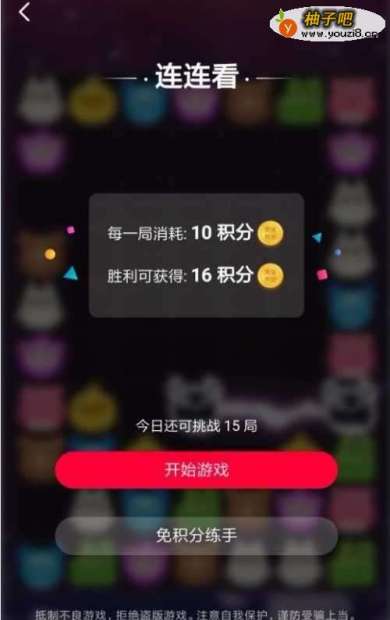7以游戏连连看为例,我们每玩一局需要消耗时自己的10积分,但是我们胜利可以获得16积分,相当于我们只要赢了一局可以获得6积分。我们一开始我们可以使用免积分练手来提升我们自己的游戏技术。