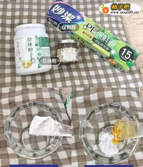 准备材料 材料有:保鲜膜、珍珠粉、蜂蜜、美容碗