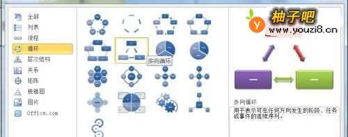 3弹出选择SmartArt图形对话框,在该对话框中选择:循环→多向循环,如下图所示。