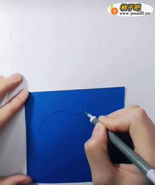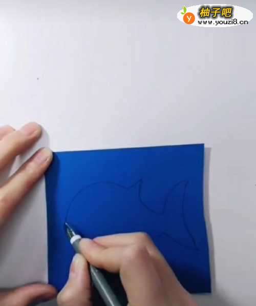 2在蓝色的纸上面画出金鱼或者鲨鱼的简笔画。这一步骤如果幼儿不太会画,可以在课前的或者是教师进行想一想鲨鱼或者鲸鱼是什么样子的