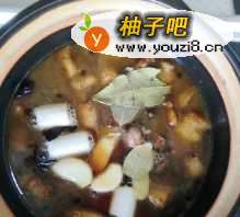 加入大葱,蒜,姜片,香叶,桂皮,砂仁,肉桂,丁香。加入开水大约400毫升。用砂锅煮大火煮10分,转文火一个小时左右。加入食盐20克搅拌,收汁出锅。