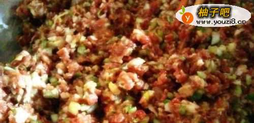 先将猪肉剁成肉馅,在肉馅中加入适量的盐、鸡精、葱