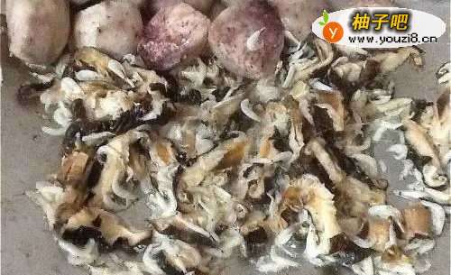 2把芋头推至旁边,放入香菇、虾皮、肉末炒香。