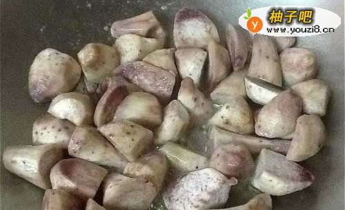 起锅,开中小火,放入适量的油,芋头以半煎炸的方式,先煎至表面微黄。