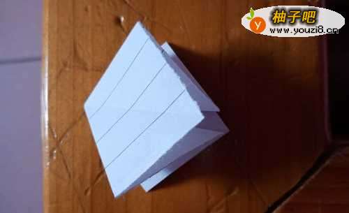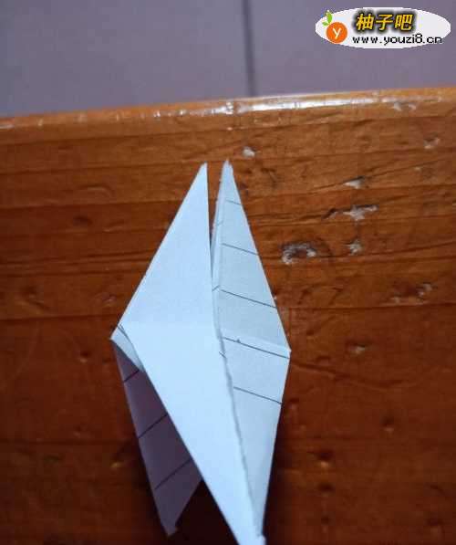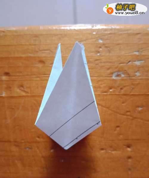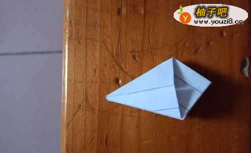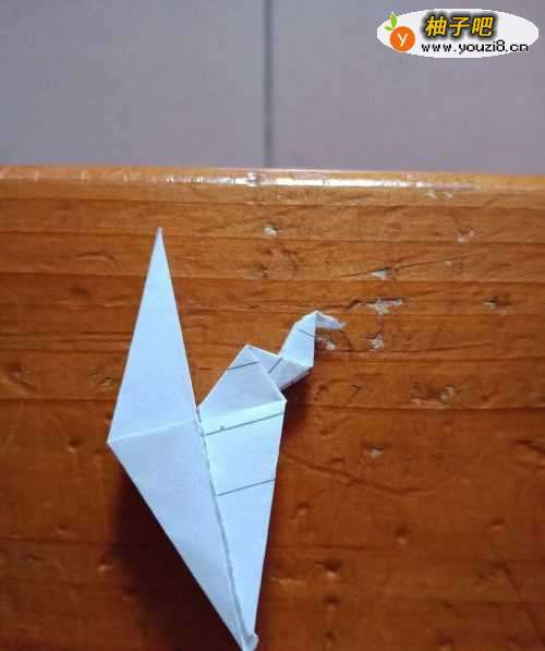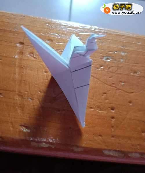 6然后把上面露出的两个尖尖折一个变成千讨屈救纸鹤的头,另一个就是尾巴,把翅膀拉到中间千纸鹤就完成了。