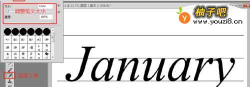 6在左边工具箱里找到铅笔工具,然后调整适当的笔尖大小,在单词上按着Shift键画出四条线即可