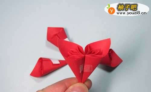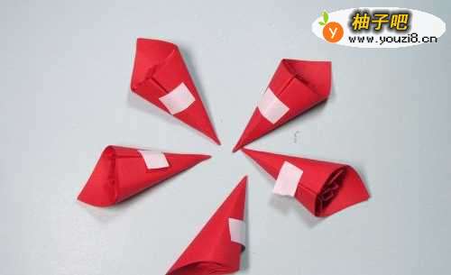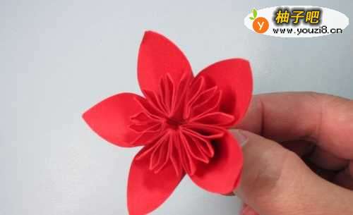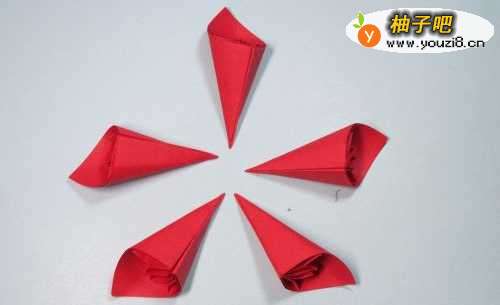 11第11步、将其余的四张小正方形纸,也按照同样的方法折成这个形状。总共得到5个这样的花瓣。