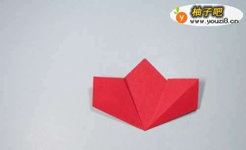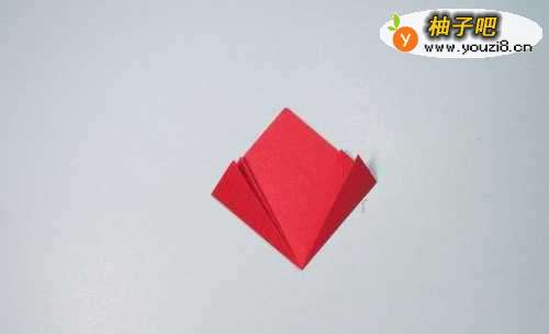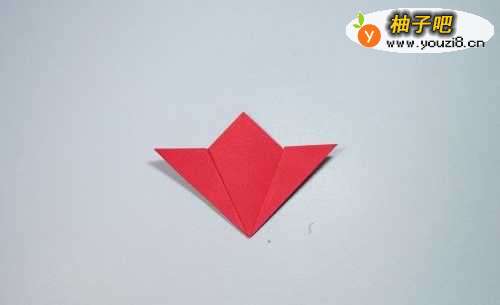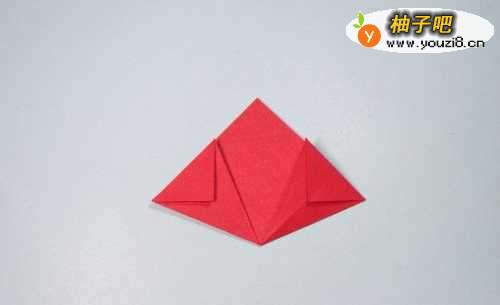 7第7步、将左右两侧露在外面的两个角,沿着叠边向内翻折,形成两个大小相同的等腰三角形。