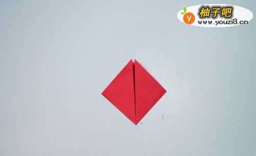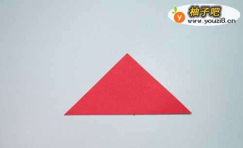 2第2步、取出其中的一张,将两个对角对折在一起,两个角对齐,形成一个等腰三角形。