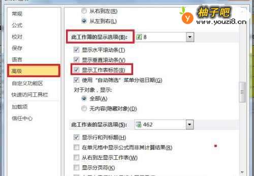 5在EXCEL中,打开【8.XLSX】后,点击左上角的【文件】→【选项】→弹出【EXCEL选项】对话框→点选【高级】→【此工作簿的显示选项】→去掉勾选的【显示工作表标签】→【确定】,如下图所示。