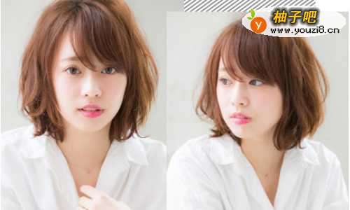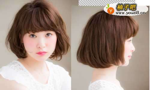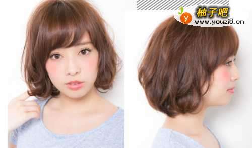 遮眉的微卷齐刘海搭配蓬松的波波头造型超有气质,再加上棕色的染发让妹子变粉嫩少女。