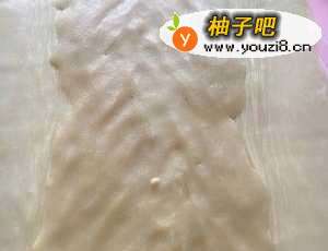 7把四周的水皮折起来完全地包住油酥,然后再次擀成薄薄的长方形。(擀好的面皮忘记拍照了)