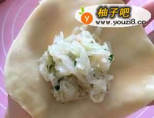 12剂子饧发好后我们就开始来包馅啦。取一枚剂子,擀圆,包住馅料