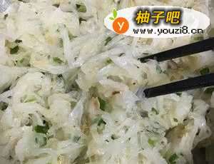 3来做馅料了:萝卜擦丝,烧一锅开水,把萝卜丝放入开水中烫一到两分钟,捞出浸凉水,再用手把萝卜丝挤干水分。这一步尽量挤干点,不然后面馅料会出水很湿不好包也影响口感。