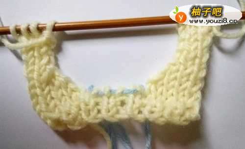 2然后开始挖圆领。中间留4针用线头穿起,左右各6针。