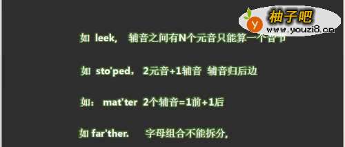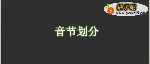 音节划分。 英语中以元音来划分音节,一个元音一个音节,以此类推,辅音是音节的分界线,但两辅音之间不管有多少元音都是一个音节。如leek,只能算一个音节。两元音字母之间有一个辅音字母时,辅音字母归后一音节。如,sto'ped。有两个辅音字母时,一个辅音字母归前一音节,一个归后一音节,如: mat'ter .字母组合不能拆分,如 far'ther.
